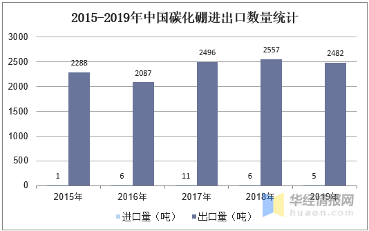 2015-2019年中國碳化硼進出口數(shù)量統(tǒng)計
