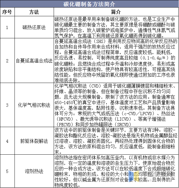 碳化硼早在1934年便被發(fā)現(xiàn),通過幾十年的研究,人們對碳化硼的結構及基本性能已熟知。但航空航天、核工業(yè)、電子信息等領域的迅速發(fā)展,對材料性能提出了更高的要求,進一步挖掘碳化硼的應用價值、拓展其應用領域仍有重大意義。目前碳化硼常用的制備方法有碳熱還原法、自蔓延高溫合成法、化學氣相沉積法、前驅體裂解法、溶劑熱法: